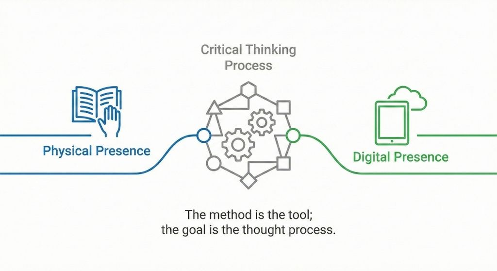 Seseorang bisa saja kuliah offline, datang setiap hari ke kampus, namun hanya memindahkan catatan dosen ke buku tulis tanpa pernah memprosesnya di otak (mental sleeping). Sebaliknya, seseorang bisa kuliah online, namun aktif mencari literatur tambahan, berdiskusi di forum digital, dan menguji argumennya.