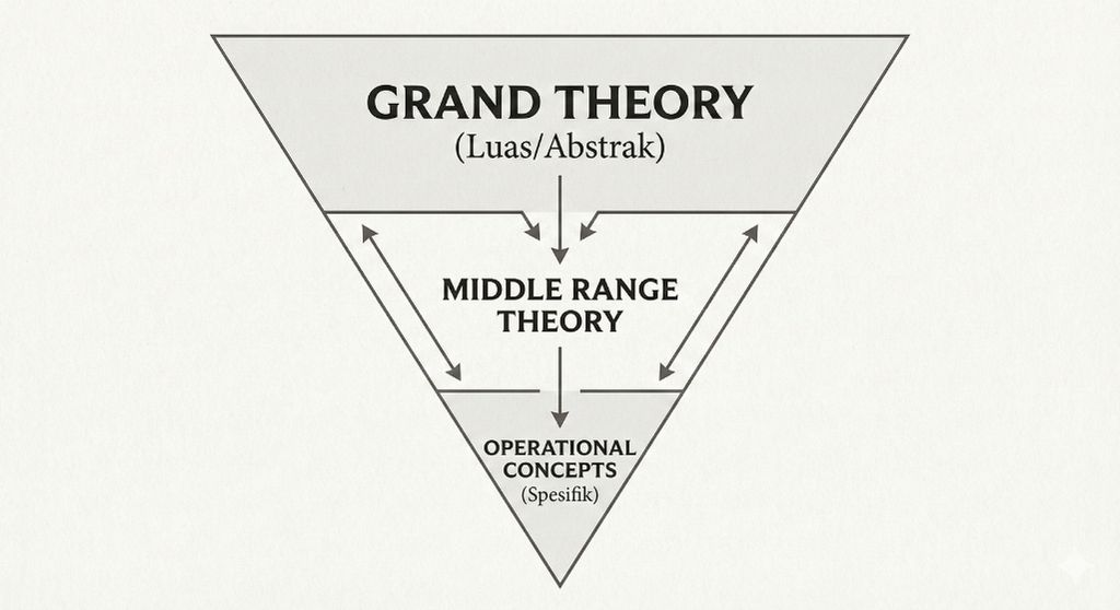 Pemahaman akan tingkatan teori ini krusial. Mengutip teori Maslow (Grand Theory) mungkin relevan untuk filosofi dasar, namun tanpa turunan teori motivasi yang lebih spesifik (Middle Range), analisis data akan terasa mengambang dan tidak membumi.